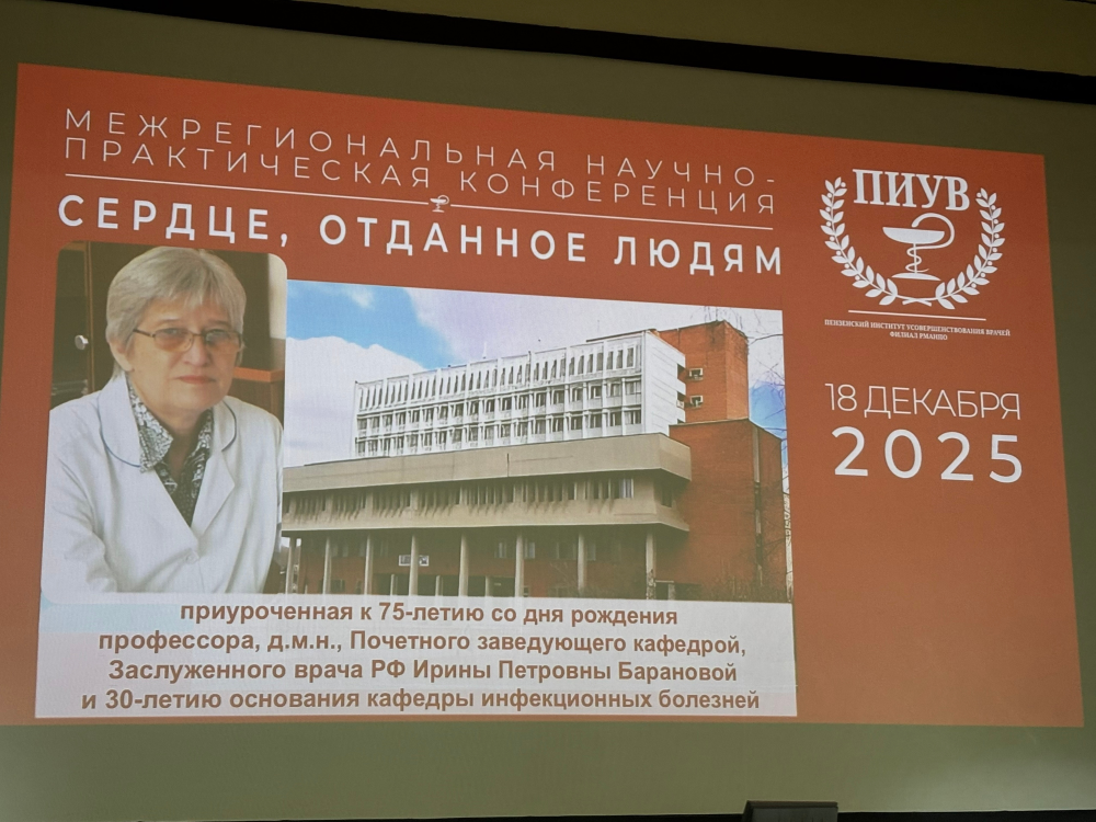 18 декабря состоялась Межрегиональная научно-практическая конференция, приуроченная к 75-летию со дня рождения д.м.н., профессора, основателя кафедры инфекционных болезней, Почетной заведующей кафедры инфекционных болезней Ирины Петровны Барановой и 30-летию основания кафедры инфекционных болезней Пензенского института усовершенствования врачей - филиала ФГБОУ ДПО РМАНПО Минздрава России «СЕРДЦЕ, ОТДАННОЕ ЛЮДЯМ».
