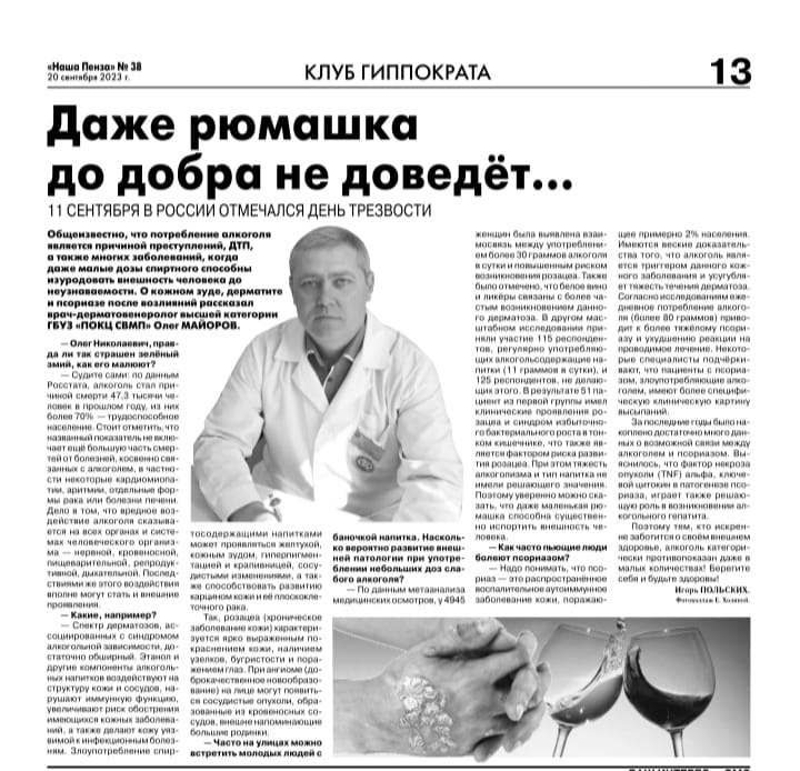 В свежем номере пензенской областной газеты "Наша Пенза" врач-дерматовенеролог Олег Николаевич Майоров рассказал о возможных кожных проявлениях после употребления алкоголя даже в самых малых дозах