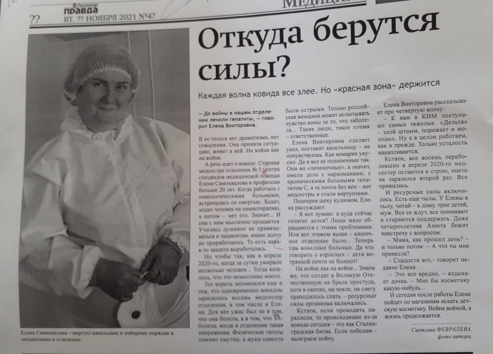 В одном из выпусков газеты «Пензенская правда» опубликована статья, главной героиней которой стала старшая медицинская сестра отделения №5 Елена Викторовна Самохвалова, которая работает в «красной зоне» с самых первых дней организации «ковидного госпиталя».