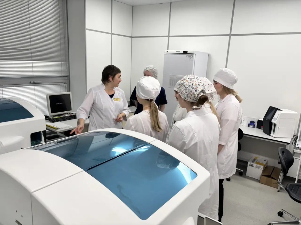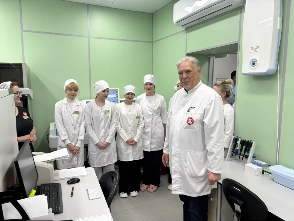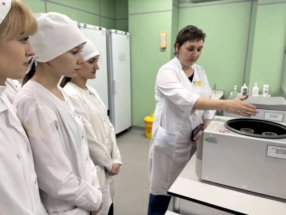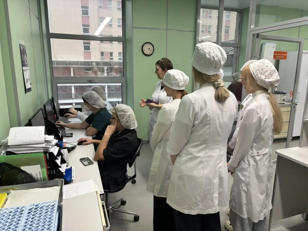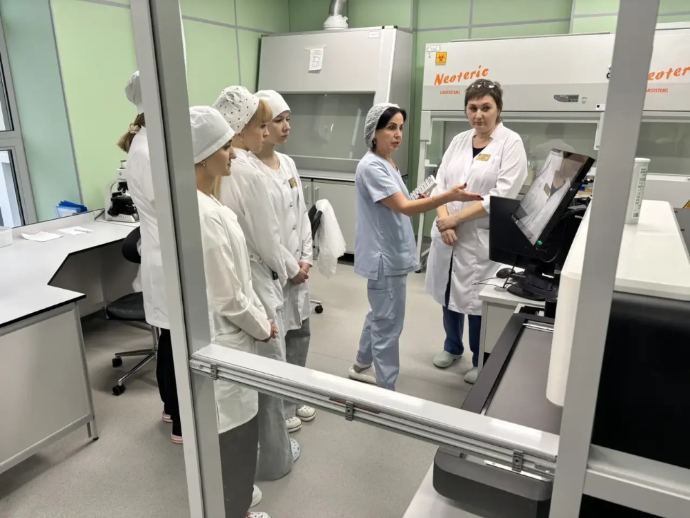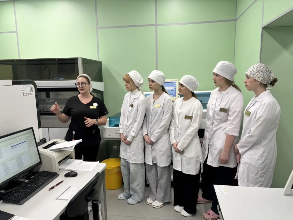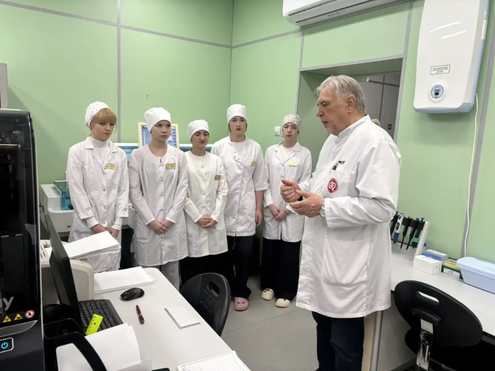 Главный врач Сергей Борисович Рыбалкин и сотрудники лаборатории познакомили будущих медиков с возможностями лабораторной диагностики.